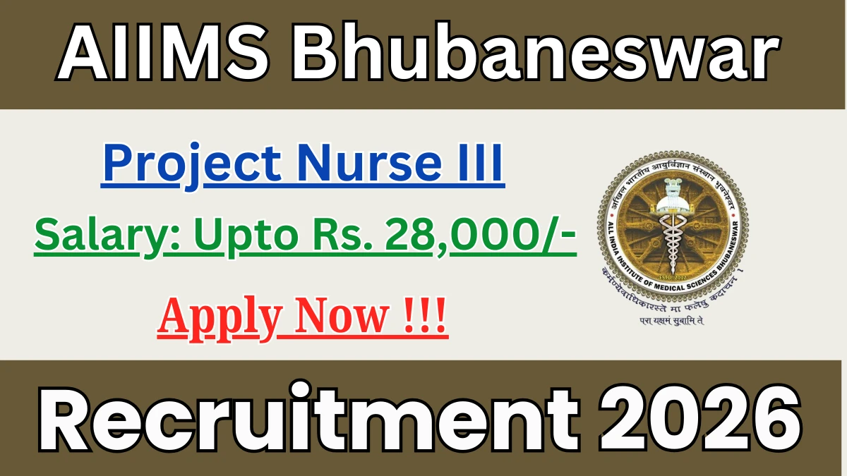 ఆల్ ఇండియా ఇన్స్టిట్యూట్ ఆఫ్ మెడికల్ సైన్సెస్ భువనేశ్వర్ (AIIMS భువనేశ్వర్) 01 ప్రాజెక్ట్ నర్స్ III పోస్టుల భర్తీకి అధికారిక నోటిఫికేషన్ విడుదల చేసింది. ఆసక్తి మరియు అర్హత గల అభ్యర్థులు అధికారిక AIIMS భువనేశ్వర్ వెబ్‌సైట్ ద్వారా ఆఫ్‌లైన్‌లో దరఖాస్తు చేసుకోవచ్చు. దరఖాస్తు ఫారమ్‌ను సమర్పించడానికి చివరి తేదీ 10-02-2026. ఈ కథనంలో, మీరు AIIMS భువనేశ్వర్ ప్రాజెక్ట్ నర్స్ III పోస్ట్‌ల రిక్రూట్‌మెంట్ వివరాలను, అర్హత ప్రమాణాలు, వయోపరిమితి, జీతం నిర్మాణం, ఎంపిక ప్రక్రియ, దరఖాస్తు దశలు మరియు అధికారిక నోటిఫికేషన్ మరియు ఆఫ్‌లైన్ దరఖాస్తు ఫారమ్‌కి నేరుగా లింక్‌లను కనుగొంటారు.