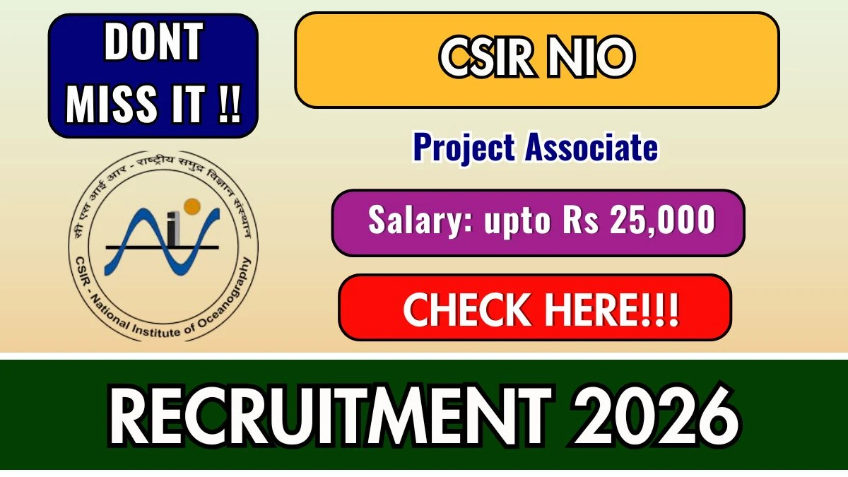 నేషనల్ ఇన్స్టిట్యూట్ ఆఫ్ ఓషనోగ్రఫీ (CSIR NIO) 01 ప్రాజెక్ట్ అసోసియేట్ – I పోస్టుల భర్తీకి అధికారిక నోటిఫికేషన్ను విడుదల చేసింది. ఆసక్తి మరియు అర్హత గల అభ్యర్థులు అధికారిక CSIR NIO వెబ్సైట్ ద్వారా ఆఫ్లైన్లో దరఖాస్తు చేసుకోవచ్చు. దరఖాస్తు ఫారమ్ను సమర్పించడానికి చివరి తేదీ 15-03-2026. ఈ కథనంలో, మీరు CSIR NIO ప్రాజెక్ట్ అసోసియేట్ – I పోస్ట్ల రిక్రూట్మెంట్ వివరాలను, అర్హత ప్రమాణాలు, వయోపరిమితి, జీతం నిర్మాణం, ఎంపిక ప్రక్రియ, దరఖాస్తు దశలు మరియు అధికారిక నోటిఫికేషన్ మరియు ఆఫ్లైన్ దరఖాస్తు ఫారమ్కి నేరుగా లింక్లను కనుగొంటారు.