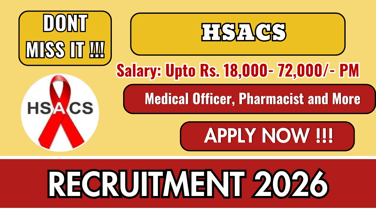 హర్యానా స్టేట్ ఎయిడ్స్ కంట్రోల్ సొసైటీ (HSACS) రిక్రూట్‌మెంట్ 2026లో మెడికల్ ఆఫీసర్, ఫార్మసిస్ట్, కమ్యూనిటీ కేర్ కోఆర్డినేటర్ (PLHIV), మరియు డేటా మేనేజర్ సహా వివిధ పోస్టుల కోసం మొత్తం 4 ఖాళీలు ప్రకటించబడ్డాయి.