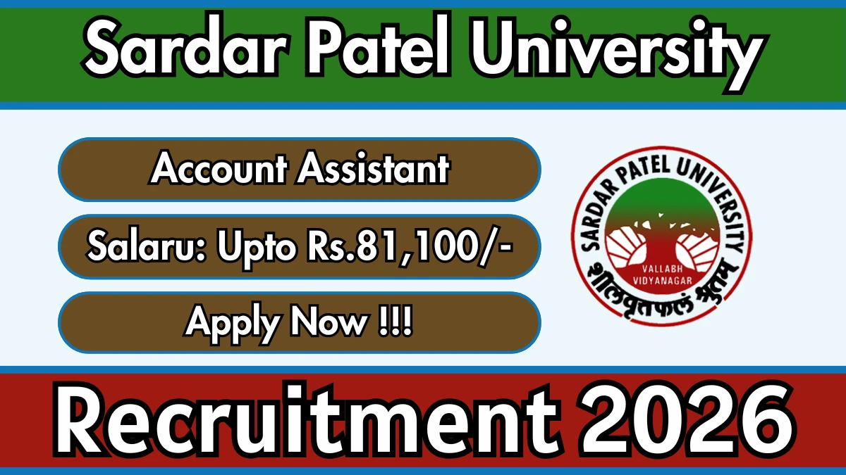 సర్దార్ పటేల్ యూనివర్సిటీ 01 అకౌంట్ అసిస్టెంట్ పోస్టుల భర్తీకి అధికారిక నోటిఫికేషన్ విడుదల చేసింది. ఆసక్తి మరియు అర్హత గల అభ్యర్థులు అధికారిక సర్దార్ పటేల్ యూనివర్సిటీ వెబ్‌సైట్ ద్వారా ఆఫ్‌లైన్‌లో దరఖాస్తు చేసుకోవచ్చు. దరఖాస్తు ఫారమ్‌ను సమర్పించడానికి చివరి తేదీ 16-02-2026. ఈ కథనంలో, మీరు సర్దార్ పటేల్ యూనివర్శిటీ అకౌంట్ అసిస్టెంట్ పోస్టుల రిక్రూట్‌మెంట్ వివరాలను, అర్హత ప్రమాణాలు, వయోపరిమితి, జీతం నిర్మాణం, ఎంపిక ప్రక్రియ, దరఖాస్తు దశలు మరియు అధికారిక నోటిఫికేషన్ మరియు ఆఫ్‌లైన్ దరఖాస్తు ఫారమ్‌కి నేరుగా లింక్‌లను కనుగొంటారు.