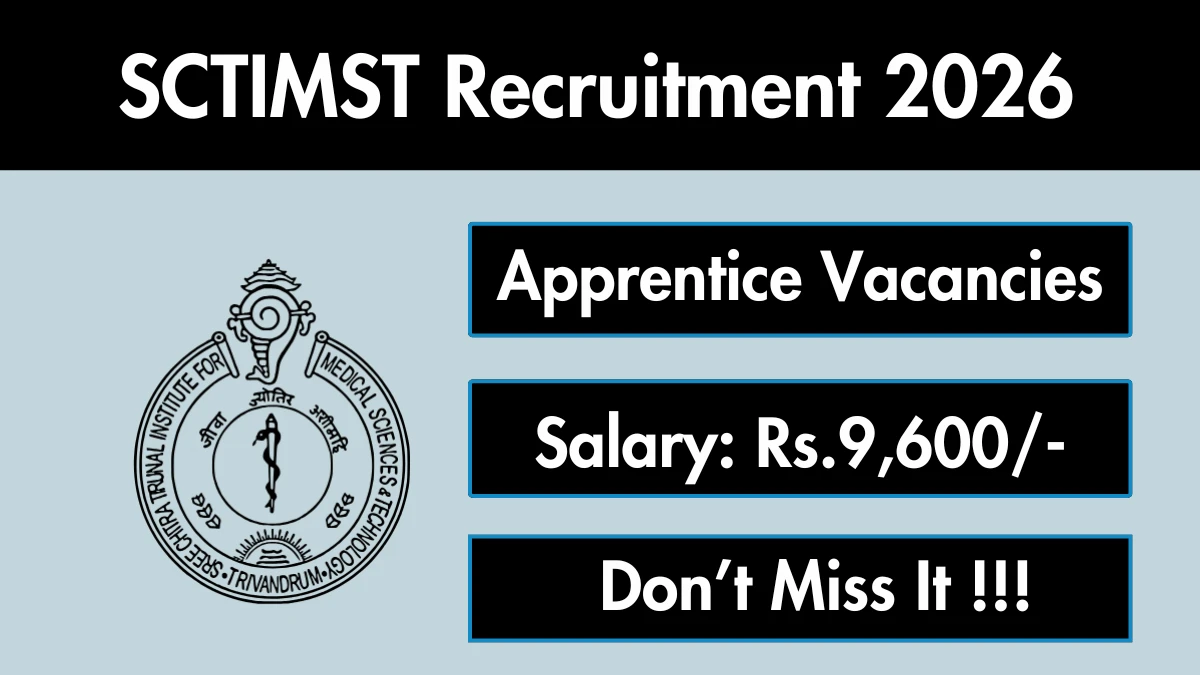 శ్రీ చిత్ర తిరునల్ ఇన్స్టిట్యూట్ ఫర్ మెడికల్ సైన్సెస్ అండ్ టెక్నాలజీ (SCTIMST) రిక్రూట్మెంట్ 2026లో 8 అప్రెంటీస్ పోస్టుల కోసం. డిప్లొమా, 12TH ఉన్న అభ్యర్థులు వాకిన్కు హాజరు కావచ్చు. 05-02-2026న వాక్-ఇన్. వివరణాత్మక సమాచారం కోసం దయచేసి SCTIMST అధికారిక వెబ్సైట్, https://www.sctimst.ac.inని సందర్శించండి.