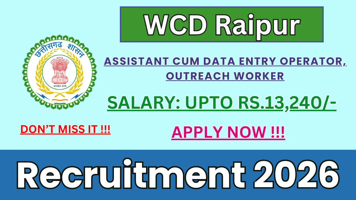 మహిళా మరియు శిశు అభివృద్ధి శాఖ రాయ్‌పూర్ (WCD రాయ్‌పూర్) 03 అసిస్టెంట్ కమ్ డేటా ఎంట్రీ ఆపరేటర్, ఔట్‌రీచ్ వర్కర్ పోస్టుల భర్తీకి అధికారిక నోటిఫికేషన్‌ను విడుదల చేసింది. ఆసక్తి మరియు అర్హత గల అభ్యర్థులు అధికారిక WCD రాయ్‌పూర్ వెబ్‌సైట్ ద్వారా ఆఫ్‌లైన్‌లో దరఖాస్తు చేసుకోవచ్చు. దరఖాస్తు ఫారమ్‌ను సమర్పించడానికి చివరి తేదీ 16-02-2026. ఈ కథనంలో, మీరు WCD రాయ్‌పూర్ అసిస్టెంట్ కమ్ డేటా ఎంట్రీ ఆపరేటర్, ఔట్‌రీచ్ వర్కర్ పోస్ట్‌ల రిక్రూట్‌మెంట్ వివరాలను, అర్హత ప్రమాణాలు, వయోపరిమితి, జీతం నిర్మాణం, ఎంపిక ప్రక్రియ, దరఖాస్తు దశలు మరియు అధికారిక నోటిఫికేషన్ మరియు ఆఫ్‌లైన్ దరఖాస్తు ఫారమ్‌కి నేరుగా లింక్‌లను కనుగొంటారు.